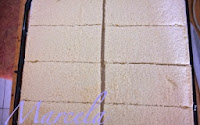 Ben 5 vagon ve bir lokomotif için 3 tepsi pişirdim. Şimdi alalım hamurumuzu ve altından kağıdı çıkarttıktan sonra önce ikiye keselim sonra her parça dörde bölelim. Öyle her vagon için 4 kat hamurumuzu olacak. Vagonların uzunluğu tepsinin uzunluğun yarısını olacak, genişliği de tepsinin çeyreği kadar.